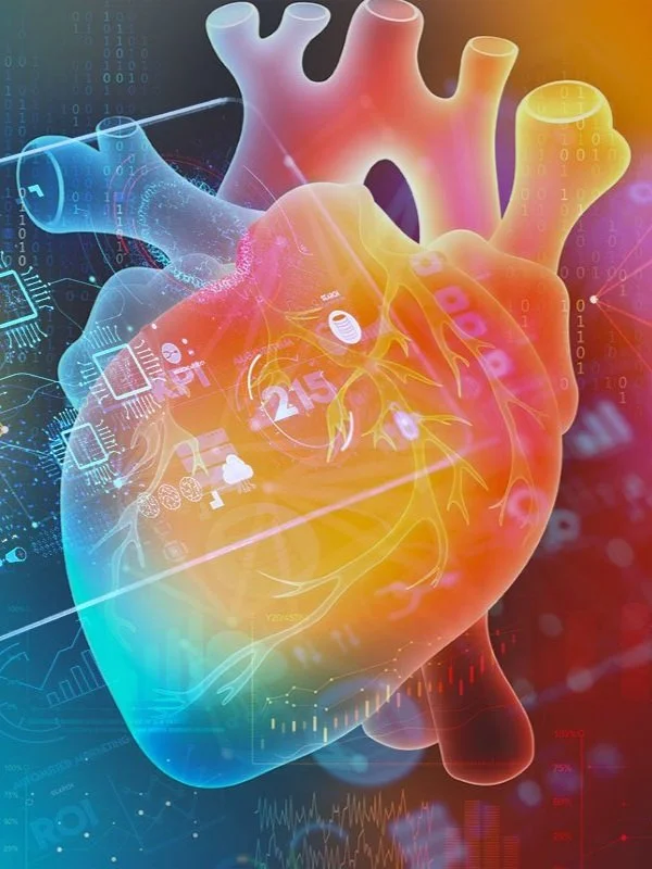 A digital, artistic rendering of a human heart with technological and data elements overlayed, emphasizing heart health and medical technology.